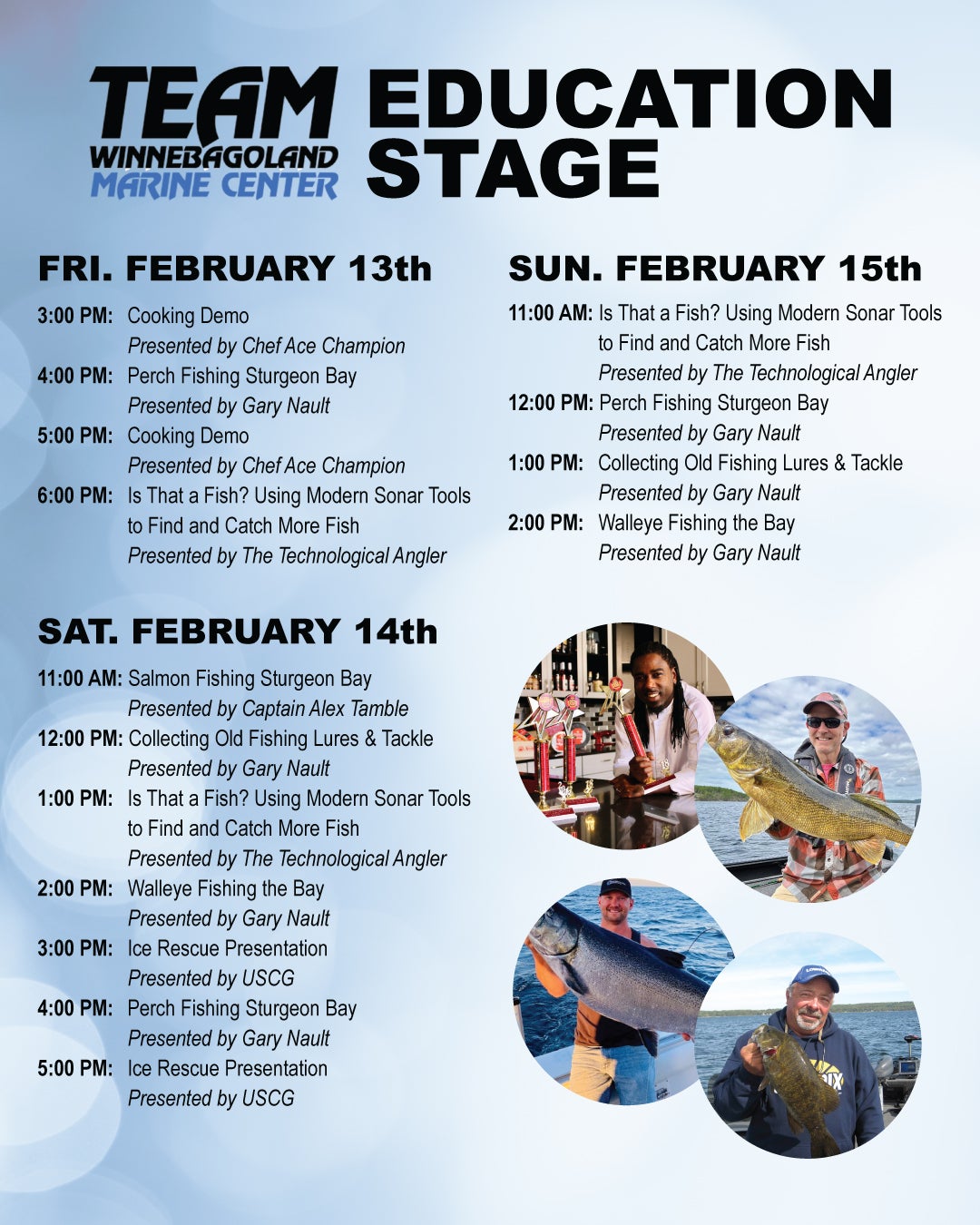 Seminars on the Team Winnebagoland Education Stage feature daily fishing seminars with the Technological Angler and Gary Nault all weekend, as well as cooking demos with Chef Ace Champion on Friday at 3pm and 5pm. Grab a coffee from Travelin’ Tom’s Coffee or a drink at a variety of bars while you visit with all of the wonderful vendors! A large array of boat dealers, dock and lift experts and vendors selling boating accessories will be here. Saturday, stop by Mr. Outboard’s Tiki Bar with special summer-inspired beverages available for purchase. From 4-7pm, each attendee may enjoy 1 complimentary beverage from the Tiki Bar. N/A options available as well. (Saturday at the Tiki Bar only)
